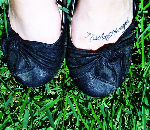 I’ve got a tattoo on my right shoulder (got it when I was 18) but it doesn’t have any real signifigance in my life. I secretly would LOVE to have Mischief Managed somewhere on my body!!