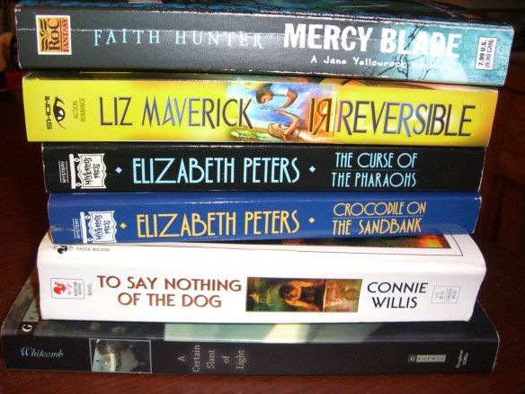 Then I MAY have gone BACK to the Greenburgh library sale. And they had a buy 4 paperbacks, get 5th free deal on Sunday, so I just HAD to get 5.. for $2. And one TPB for $1. Mercy Blade by Faith Hunter (I’m wary because I got tired of her Rogue Mage series after book 2, but I hear her UF is very different and good), Irreversible by Liz Maverick (mostly because I just want to get to all the Shomi books one day, this is the sequel to Wired which I’ve already read), Crocodile on the Sandbank and The Curse of the Pharaohs, by Elizabeth Peters (recommended by the Book Smugglers. Wish the books indicated what the book order was), To Say Nothing of the Dog by Connie Willis (recommended by calico_reaction), and A Certain Slant of Light by Laura Whitcomb (recommended by everybody).