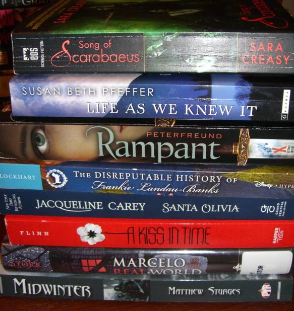 Although I already read Song of Scarabaeus, I bought another copy. I felt like I needed to “save” it.. I held myself back from also saving a copy of Tithe by Holly Black and War for the Oaks by Emma Bull. Also bought: Life as We Knew It by Susan Beth Pfeffer, Rampant by Diana Peterfreund, The Disreputable History of Frankie Landau-Banks by E. Lockhart, Santa Olivia by Jacqueline Carey (I may already own this book.. TBR is getting to that point), A Kiss in Time by Alex Flinn, Marcelo in the Real World by Francisco X. Stork, and Midwinter by Matthew Sturges. Total for this pile = $9, all bought on Saturday.