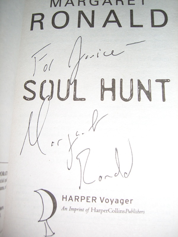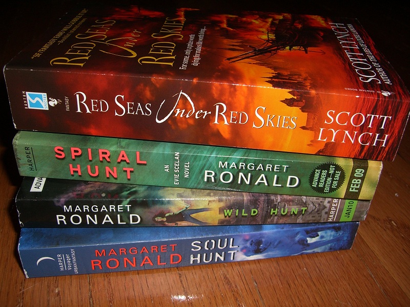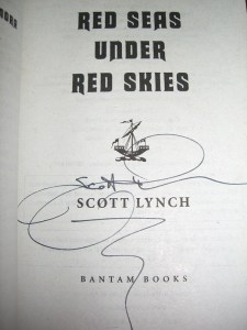 The Husband wanted his copies of his Scott Lynch books signed but we missed the author’s signing and reading on Friday and I still don’t understand how Kaffeeklatsches work, so I was happy I found a signed copy of Red Seas Under Red Skies in the dealer’s room. The other three books are my copies of the Evie Scelan books (Soul Hunt bought at the dealers room).
