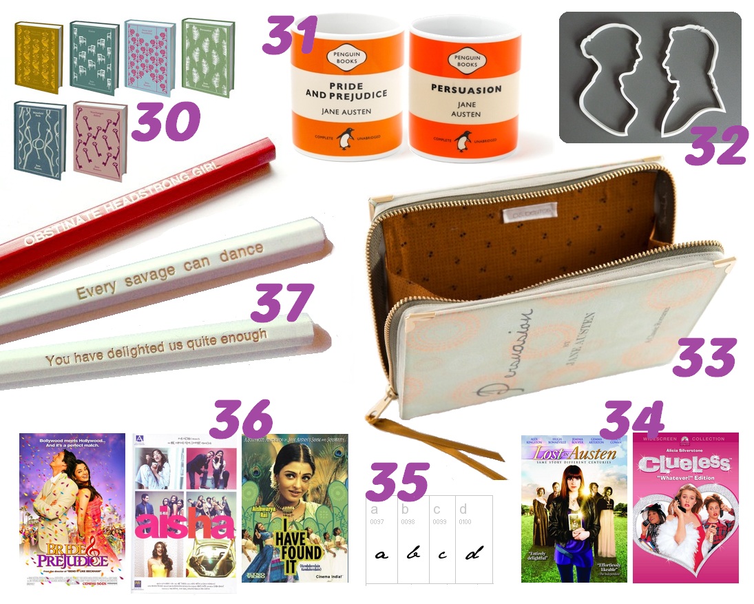 30. Penguin Clothbound/Hardcover Classics (about $20 each) 31. Persuasion mug, Pride and Prejudice mug (£8.95) 32. Jane Austen/Mr. Darcy cookie cutter set (about $16) 33. Persuasion book clutch (other Austen covers available! – 60€) 34. Jane Austen and modern day DVDs: Lost in Austen and Clueless ($4-$10) 35. Jane Austen font (free for personal use) 36. Jane Austen and Bollywood DVDs: Bride & Prejudice, Aisha (Emma adapation), and I Have Found It (S&S adaptation) ($6-$15 each) 37. Jane Austen quote pencils (6 NZD)
