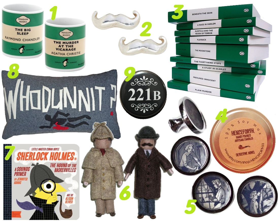 1. The Big Sleep and Murder at the Vicarage mugs (£8.95, AU$14.99, US$9.95) 2. Poirot Mustache stud earrings ($60) 3. Green Popular Penquins (AU$7.99-$9.95) 4. Detective Novel scented candle ($10) 5. Nancy Drew Drawer Pulls ($40) 6. Sherlock Holmes and Doctor Watson felt dolls ($80) – also available Miss Marple and Hercule Poirot ($45 ea). 7. Sherlock Holmes in The Hounds of the Baskervilles, a Baby Lit sound primer ($8.99) 8. Whodunnit applique pillow ($101.29) 9. 221B button ($2.56)