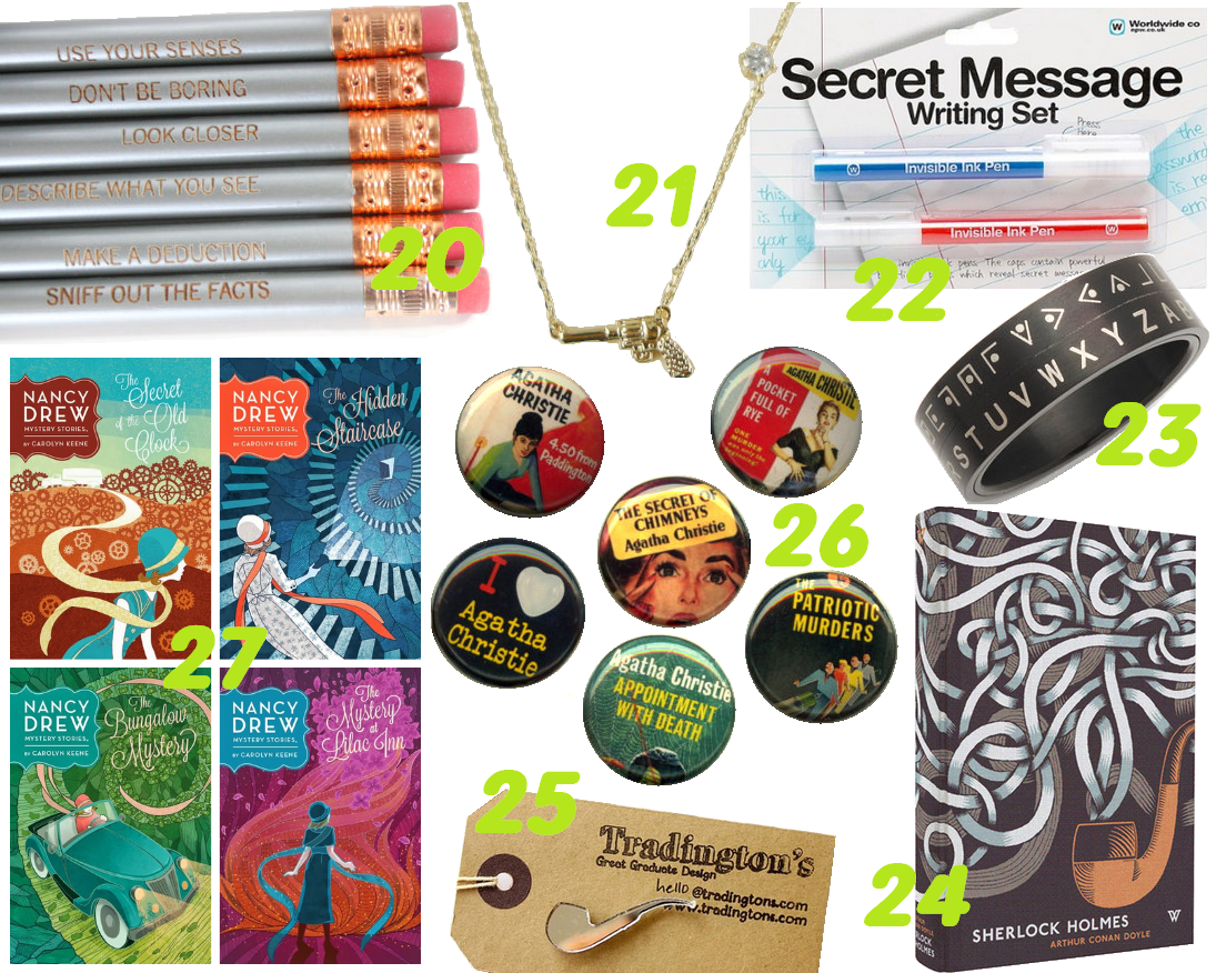 20. The novelist & the detective (set of 6 pencils – $8) 21. Tiny gun necklace ($15) 22. Secret Message Writing set ($9.59) 23. Secret Decoder Ring, Pig Pen Cipher ($15) 24. White’s Books Fine Edition Sherlock Holmes: His Greatest Cases (from $23.82) 25. Pipe pin badge ($8.56) 26. Agatha Christie 1″ buttons (set of 10 for $11) 27. Nancy Drew with redesigned covers ($6.99 ea)