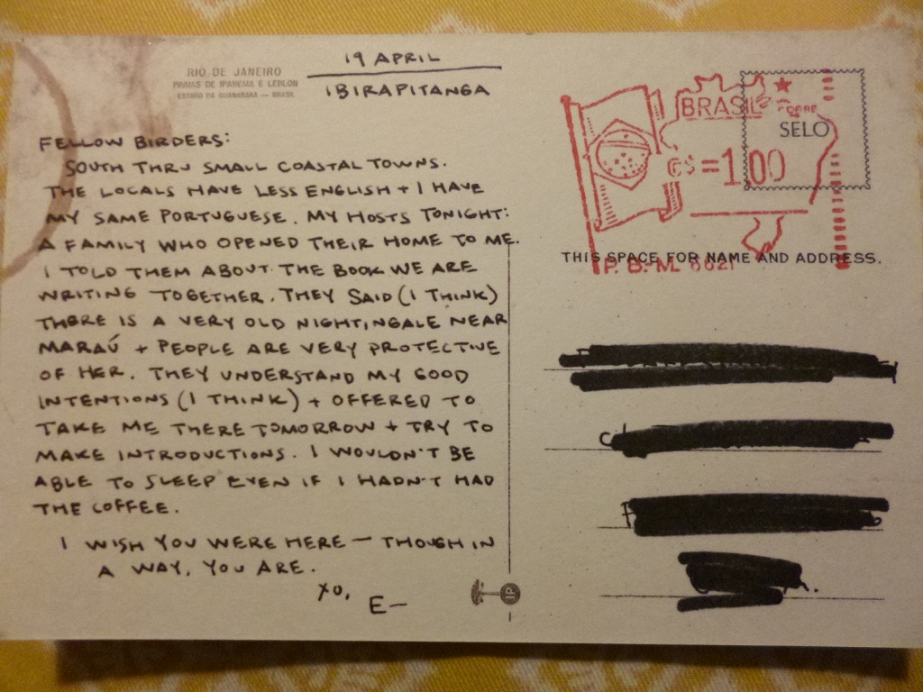 Adult Editor Insight Panel: This turned out to be a buzz panel where each of the editors discussed books they were particularly excited about this year. Joshua Kendall of Mulholland Books talked about two books: The Shining Girls by Lauren Beukes (who won the Arther C. Clarke award for her Zoo City), about a time traveling serial killer (“imagine Silence of the Lambs written by Margaret Atwood”), and S, a book by JJ Abrams and Doug Dorst which he says reorients your experience as a reader (he compares it to House of Leaves) and is a book about storytelling. There will be 20 to 22 pieces of ephemera related to S and the first one is a postcard from Brazil (see picture below). Patrick Nielsen Hayden of Tor Books discussed Jo Walton’s What Makes This Book So Great, which is a collection of selected tor.com essays by Walton in which she rereads books and discusses them; Twenty-First Century Science Fiction, a collection of science fiction stories; and The Incrementalists by Steven Brust and Skyler White, a supernatural procedural centered around a society with special powers and a goal to make the world a little bit better a little bit at a time. Mary-Theresa Hussey talked about The Returned by Jason Mott, which is about people who have died returning to their families, and Sarah Beth Durst’s first adult trilogy which begins with The Lost, and is about a small town in the desert where missing things go – this includes the heroine, Lauren. Out of all the books discussed, I was most interested in Sarah Beth Durst’s and Jo Walton’s, so they’re going on my “what to watch for” list.
